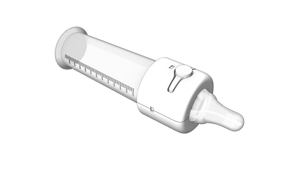 The Preemie-Pacer allows the feeder to stop the flow of milk without tilting or removing the bottle nipple from the infant’s mouth, allowing nonnutritive sucking to continue while the infant regains their physiological and energy balance to continue the feeding. Milk flow is enabled by releasing the finger on the flow button and is stopped by pushing the flow button. This allows the infant to reduce energy expenditure and physiological stress, which could provide them the opportunity to optimize consumption of the full feeding amount.